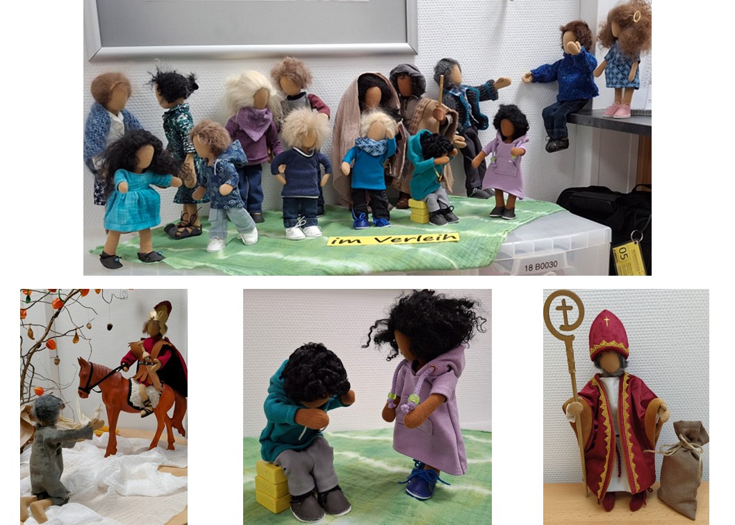 Aus eigener Herstellung, bieten wir Erzählfiguren der unterschiedlichsten Größe und Kleidung zum Verleih an. Die Beweglichkeit der gesichtslosen Figuren ermöglicht es, vielfältige Emotionen auszudrücken. Daraus ergeben sich vielfältige Einsatzmöglichkeiten in Kindergarten und Grundschulen. Sowohl der Einstieg z.B. ins Thema "Freunde", "Streit" oder Mobbing als auch die Visualisierung z.B. der Legenden des hl. Martins / hl. Nikolauses, ist möglich.